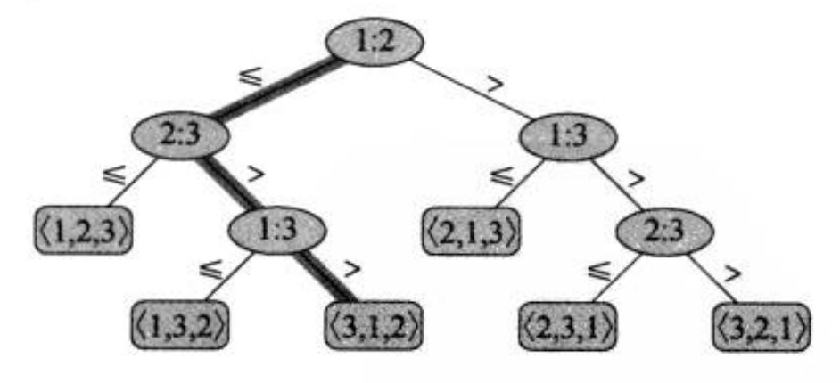 在决策树中,每个内部结点都以i : j i:\ j i : j 标记,其中,i i i 和j j j 满足1 ≤ i , j ≤ n 1\le i,\ j\le n 1 ≤ i , j ≤ n ,n n n 是输入序列中的元素个数。每个叶结点上都标注一个序列。排序算法的执行对应于一条从树的根节点到叶结点的路径。对一个正确的比较排序算法来说,n n n 个元素的n ! n! n ! 种可能的排列都应该出现在决策树的叶结点上。