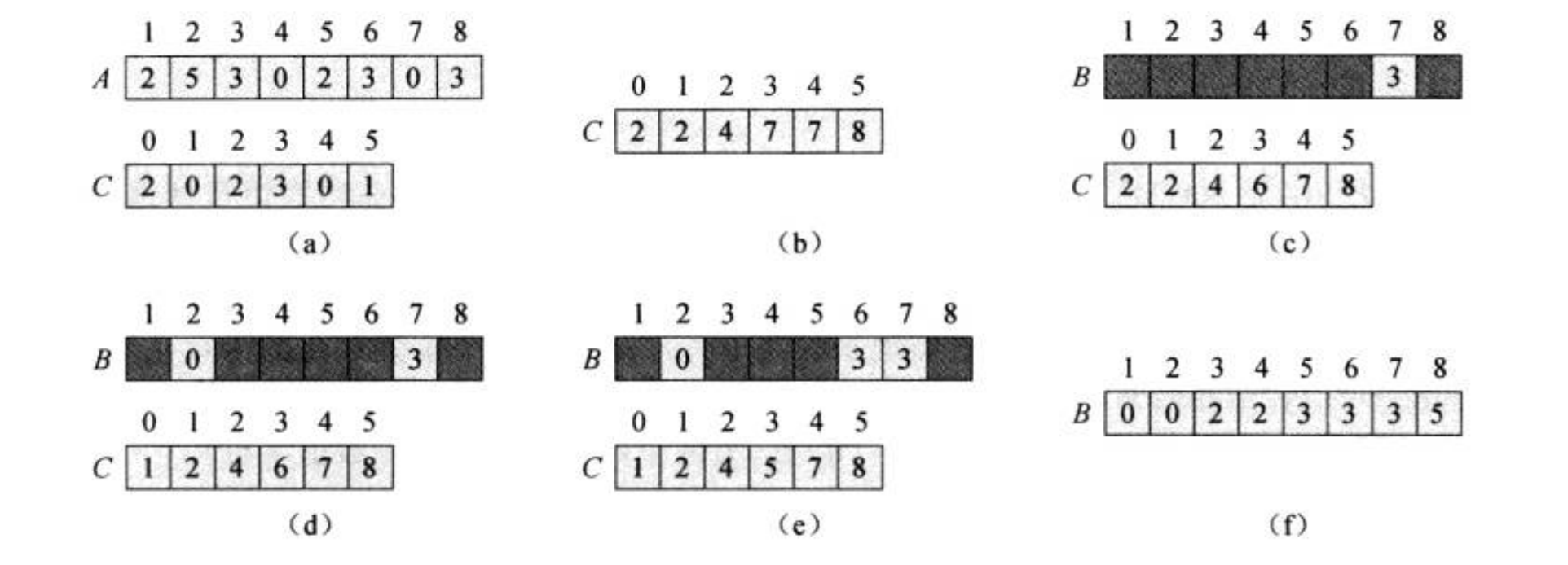 1 2 3 4 5 6 7 8 9 10 11 COUNTING-SORT(A, B, k) let C[0..k] be a new array for i = 0 to k C[i] = 0 for j = 1 to A.length C[A[j]] = C[A[j]] + 1 //数组C存放A中元素的个数,C的下标就是A中元素的值,C的值就是A中元素的个数 for i = 1 to k C[i] = C[i] + C[i-1] //C数组的元素不断累加到C数组的后一个位置,最后一个位置的值是A中所有元素的数量,C[i]表示所有不大于i的元素的数量 for j = A.length downto 1 B[C[A[j]]] = A[j] //A[j]是A数组中的某个值,C[A[j]]是A数组中不大于A[j]的元素个数,假如有3个,那么应该放在第4个位置,即B[3] C[A[j]] = C[A[j]] - 1 //C表中删除已放到B表的那个数