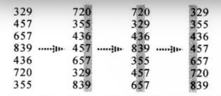 基数排序先按最低有效位进行排序,对每个卡片只按最低位依次放入对应序号的容器中,再按容器顺序取出卡片合并成一叠,这时候按照次低位放入容器,以此类推。