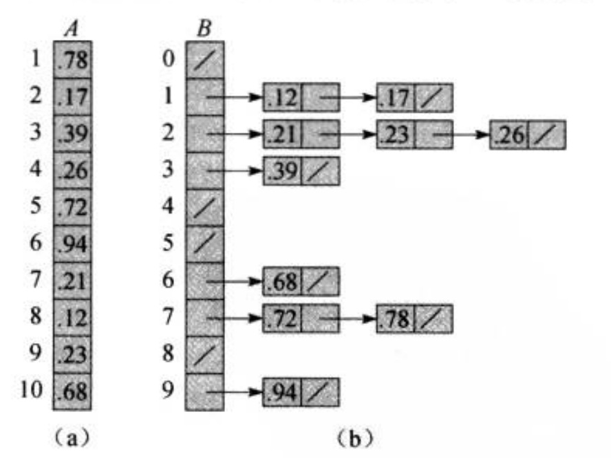 假设输入是包含n n n 个元素的数组A A A ,且每个元素满足在[ 0 , 1 ) [0,\ 1) [ 0 , 1 ) 之间,临时数组B B B 用来存放链表(桶)